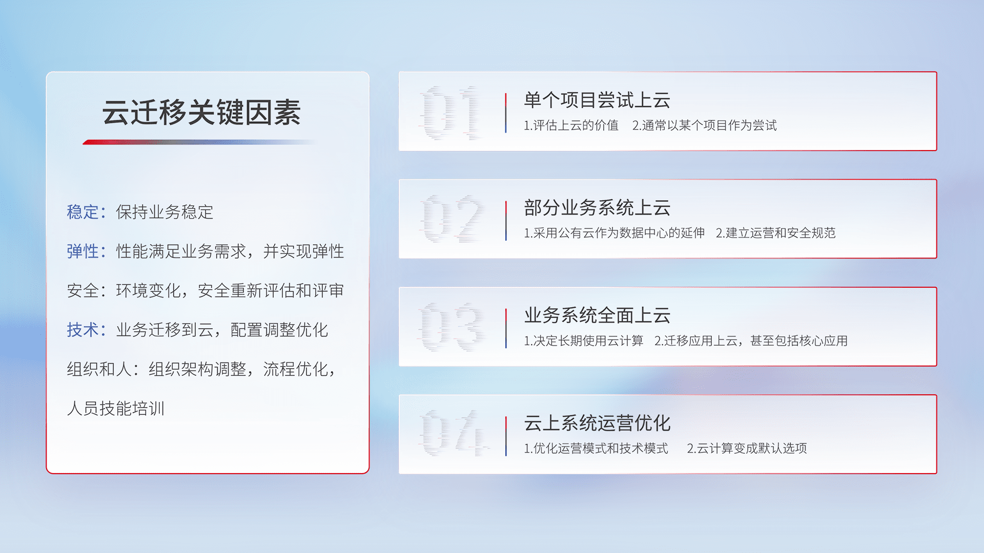 结合实际业务,,从规划设计、、、、云平台选型、、云原生改造、、数据迁移、、集成交付,,迁移全过程为客户识别最佳上云路径,,做好风险识别管理,,,设计网络架构、、身份权限、、、、安全审计合规、、、操作审计、、日志审计、、、监控告警策略、、多站点容灾设计等,,对云上基础设施进行整体规划,,提升IT治理水平,,以满足弹性、、高可用、、、高性能的需求。。。。