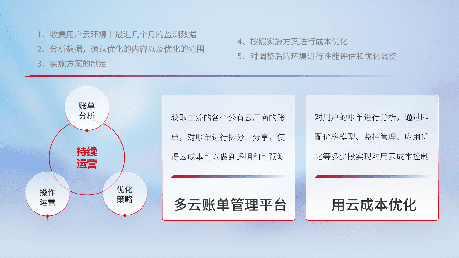 通过多云纳管,,以统一的资源数据模型把客户的云资源进行抽象和封装,,,进而实现对多云资源的统一操作,,,,保障云资源管理的可靠性、、、、稳定性与可用性。。量身定制化运维内容,,,,配置、、、开发运维、、、补丁管理、、、备份、、、、监控、、、认证和访问管理、、、、审计和日常巡检等,,,保障在用云过程中的可靠度,,,,稳定度以及高可用率。。